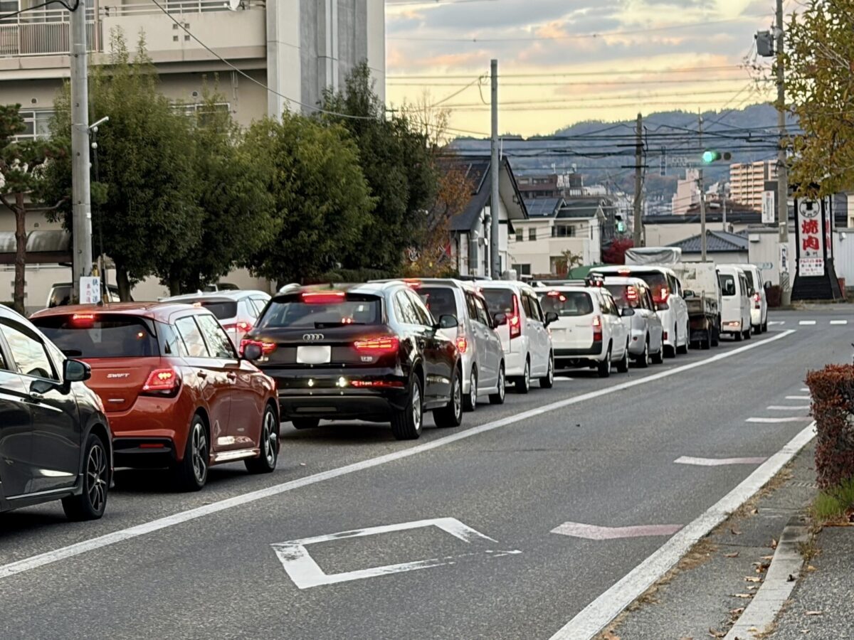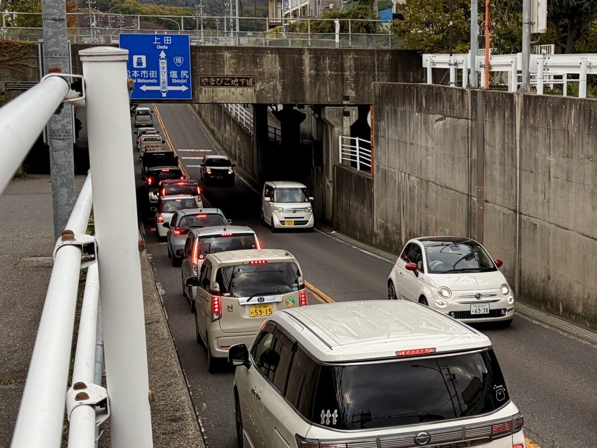 やまびこ地下道を抜けた「出川西交差点」を先頭に、国道19号と交わる「高宮交差点」の西側まで1.2kmの渋滞となっていた。